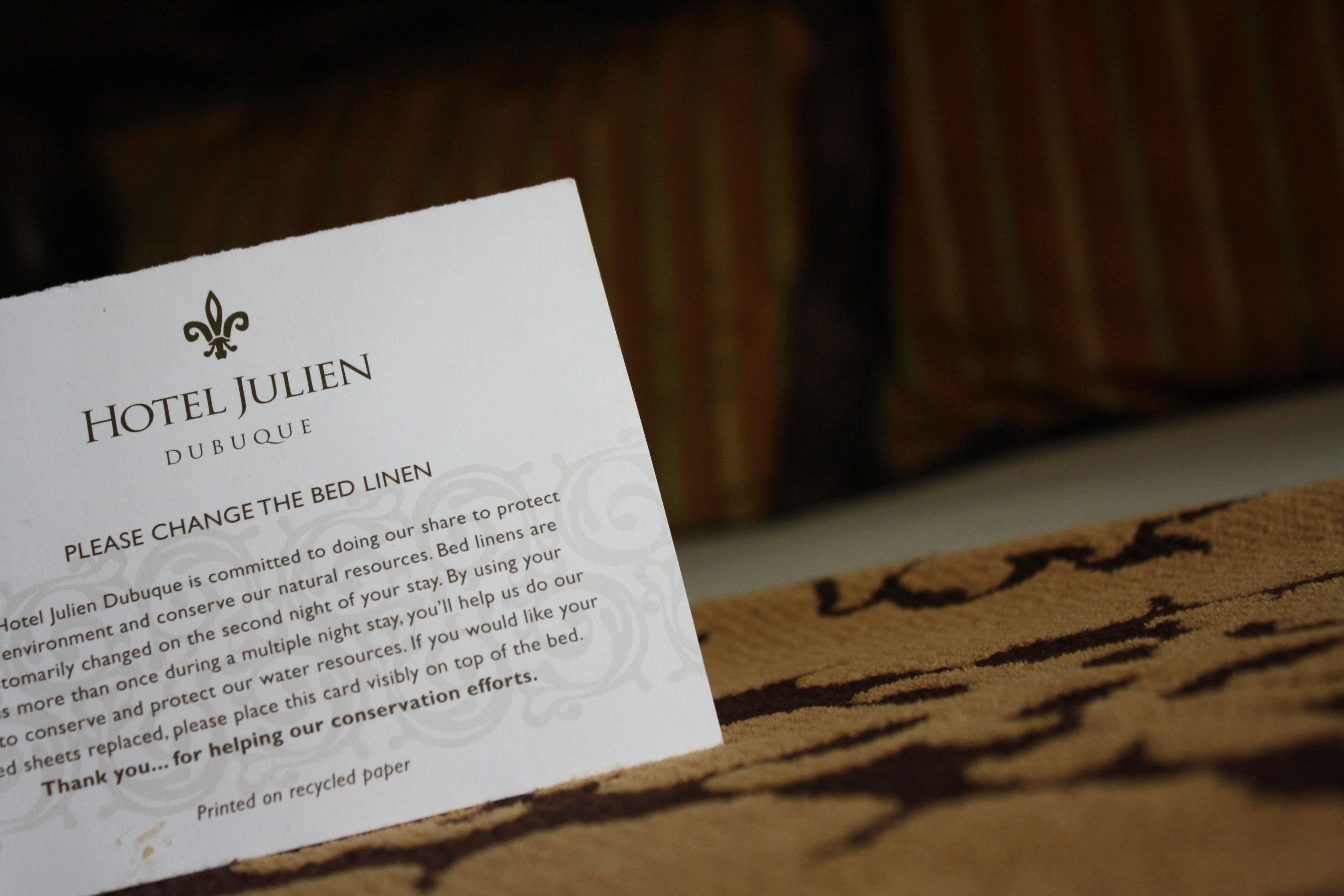 We got into Dubuque, Iowa around 7 p.m. and checked into Hotel Julien (beautiful) where the decor and class is remarkably similar to Bellagio, right down to the marble countertops in the bathroom and the brushed pewter drawer pulls. Dinner was nice at the Pepper Sprout, but despite the amazing brie and roasted garlic appetizer, it became a tad bit tense after Mom and I got into a relatively spirited conversation about relationships. I practically leapt up onto my soapbox and started preaching about how important it is in a relationship to have space and separate interests or else it’ll never work, you’ll want to kill each other, and you’ll spend your lives miserable and codependent. This *may* have had something to do with the fact that there were approximately 17 phone calls that took place during the car trip to Iowa (to/from the same two people- hint, I didn’t talk to a single person today). I finally snapped when the host at the restaurant came up to our table with their house phone in hand, saying to my mom, “I’m sorry to interrupt, but Tom wants to know why you’re not answering your cell phone…” Seriously? Aaaaaaahhhhh….. SNAP. That was me, cracking like an egg. I bit my lip, chugged my Strongbow, and tried not to say anything I might regret. I’m kind of allergic to conflict these days, so I felt extremely bad saying anything- but several phone calls an hour, including one to the restaurant, is a bit much. So I don’t think it was passive aggressive of me in the slightest to climb up on my “no more codependent relationships” soapbox when given the opportunity…
