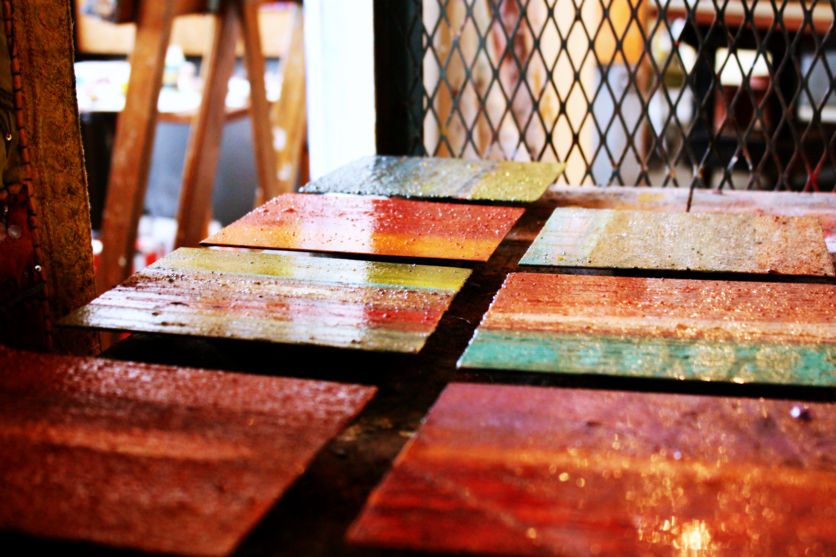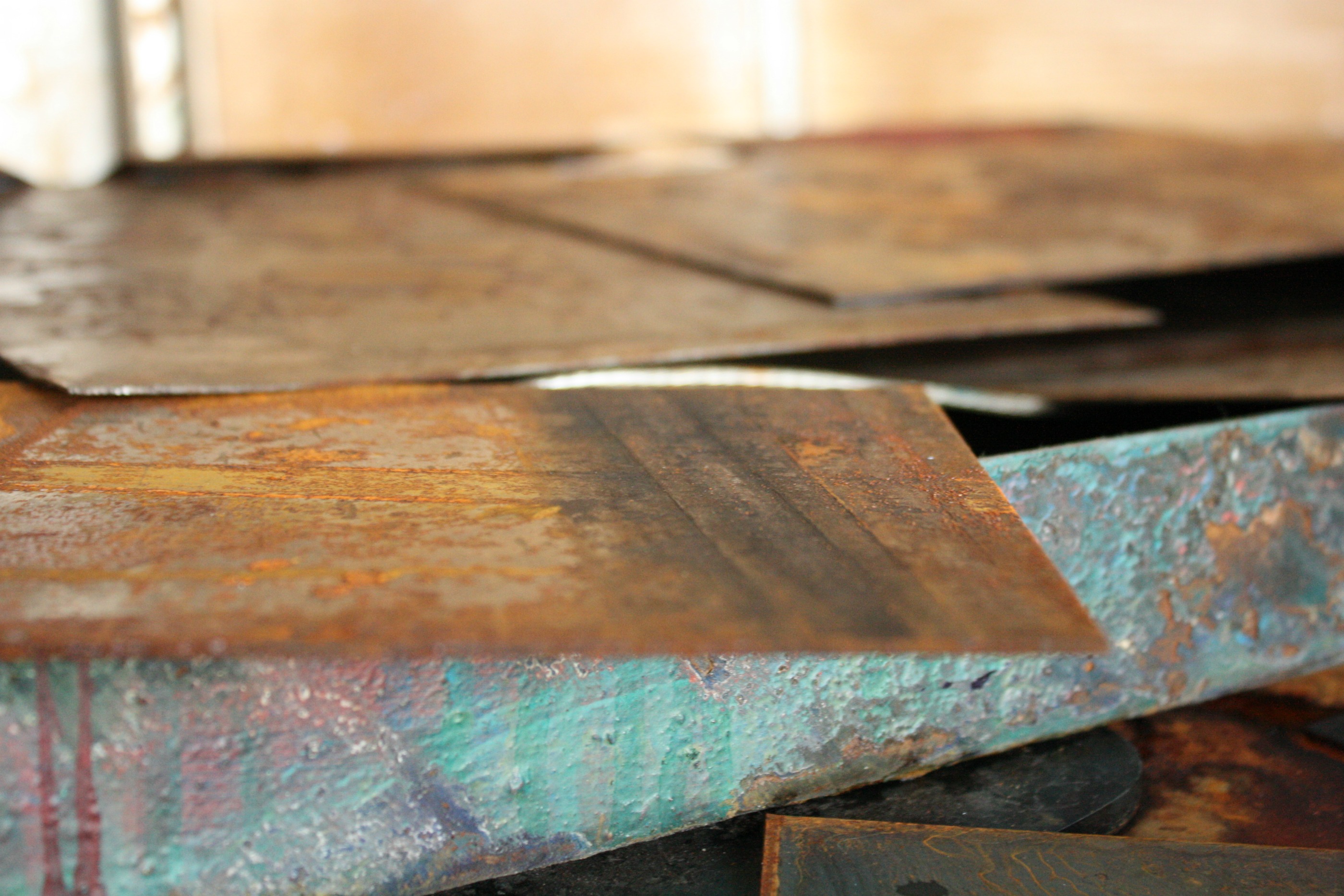After rolling up the sleeves of my white tuxedo shirt (a happy alternative to the traditional smock), I witnessed the creative process in various stages… from the very beginning when the sheets of steel were treated with vinegar and sand, covered in plastic and left to corrode, to the process of applying color and texture, layer after layer. “There are no mistakes…” was the only rule. At first, I was worried about “messing up” (as I tend to be in new situations), but I experimented with different colors, sand, powders, brushes, and rollers.